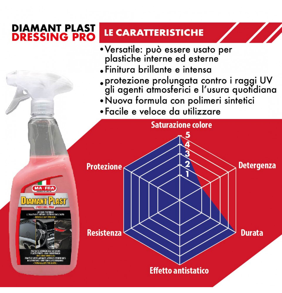 DiamantPlast Dressing Pro รจ ideale per superfici interne ed esterne in plastica, gomma e vinile, come cruscotti, pannelli delle portiere, finiture esterne, modanature, pneumatici passaruota, plastiche del vano motore e altro e altro ancora.